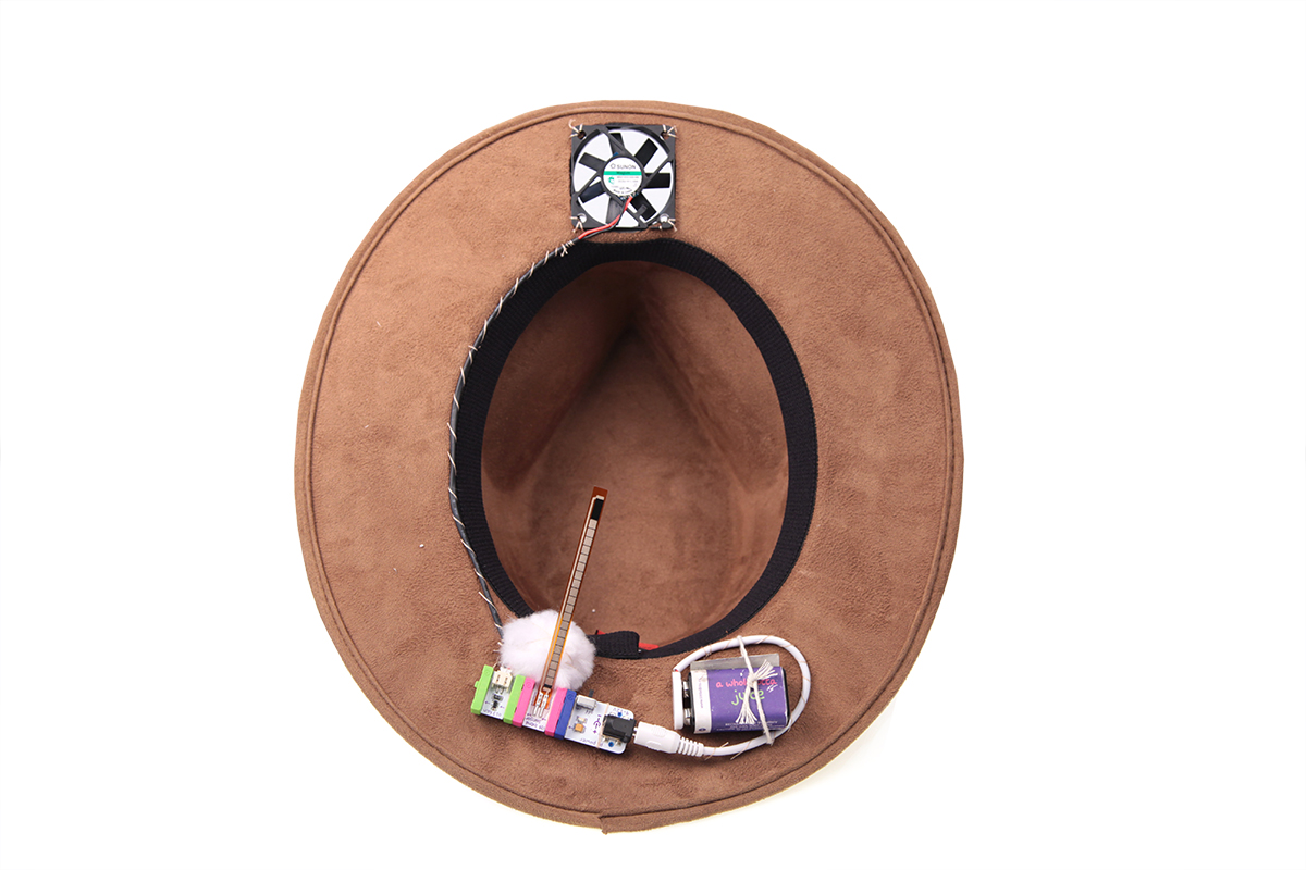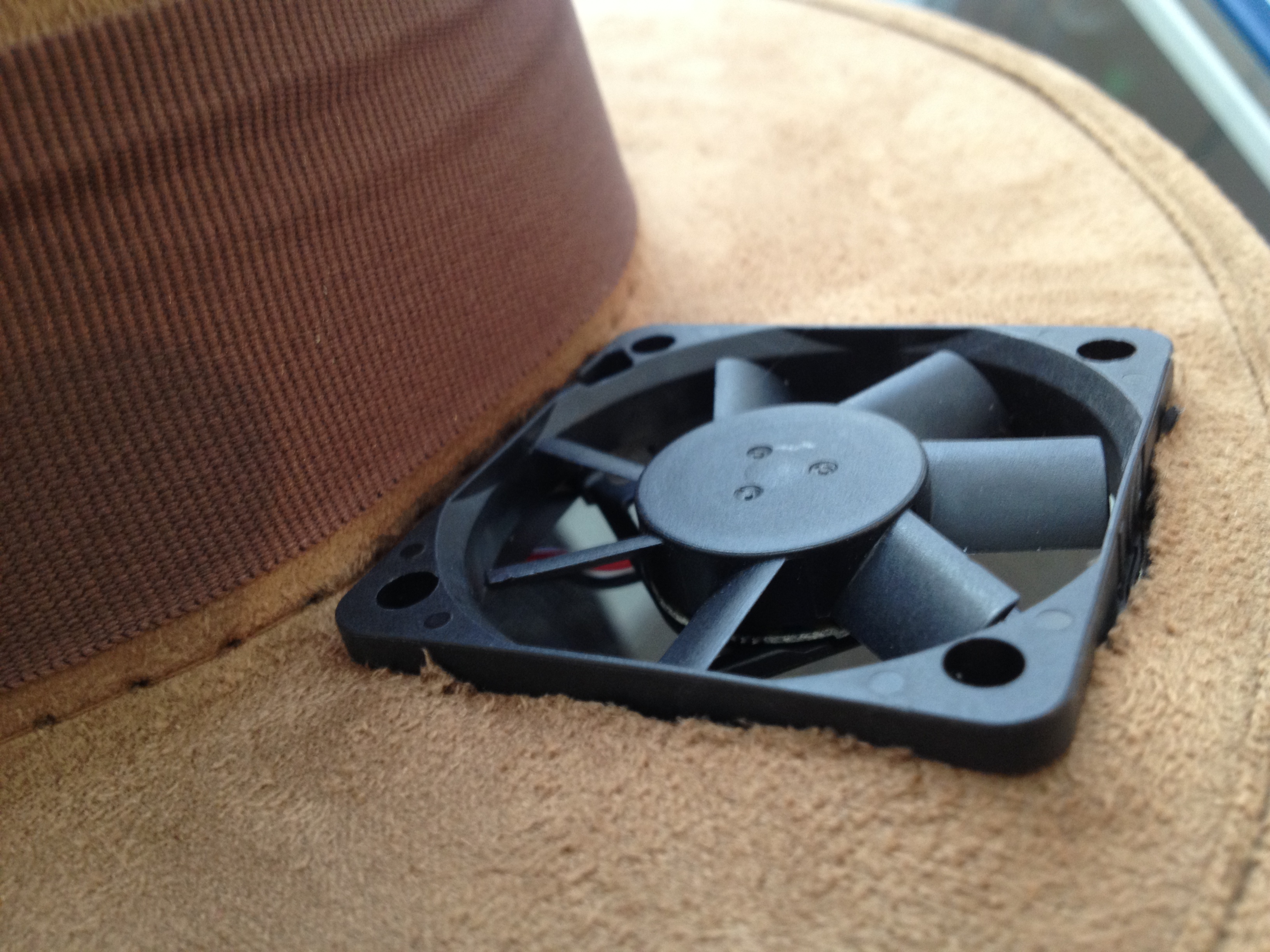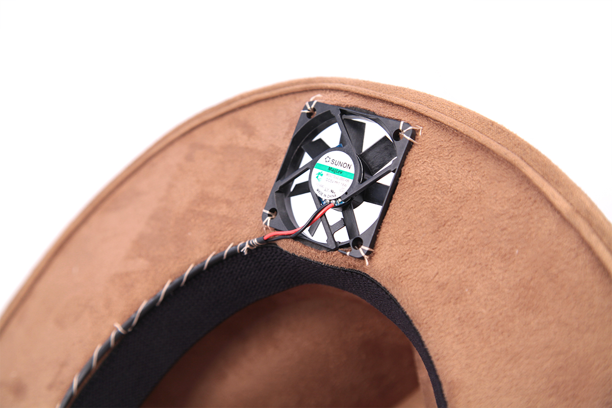 Find a hat that you don't mind cutting up. Lay your circuit out on the underside of the hat. Place the fan at the front of the hat and wrap the rest of the bits around so that they sit at the back of the hat.