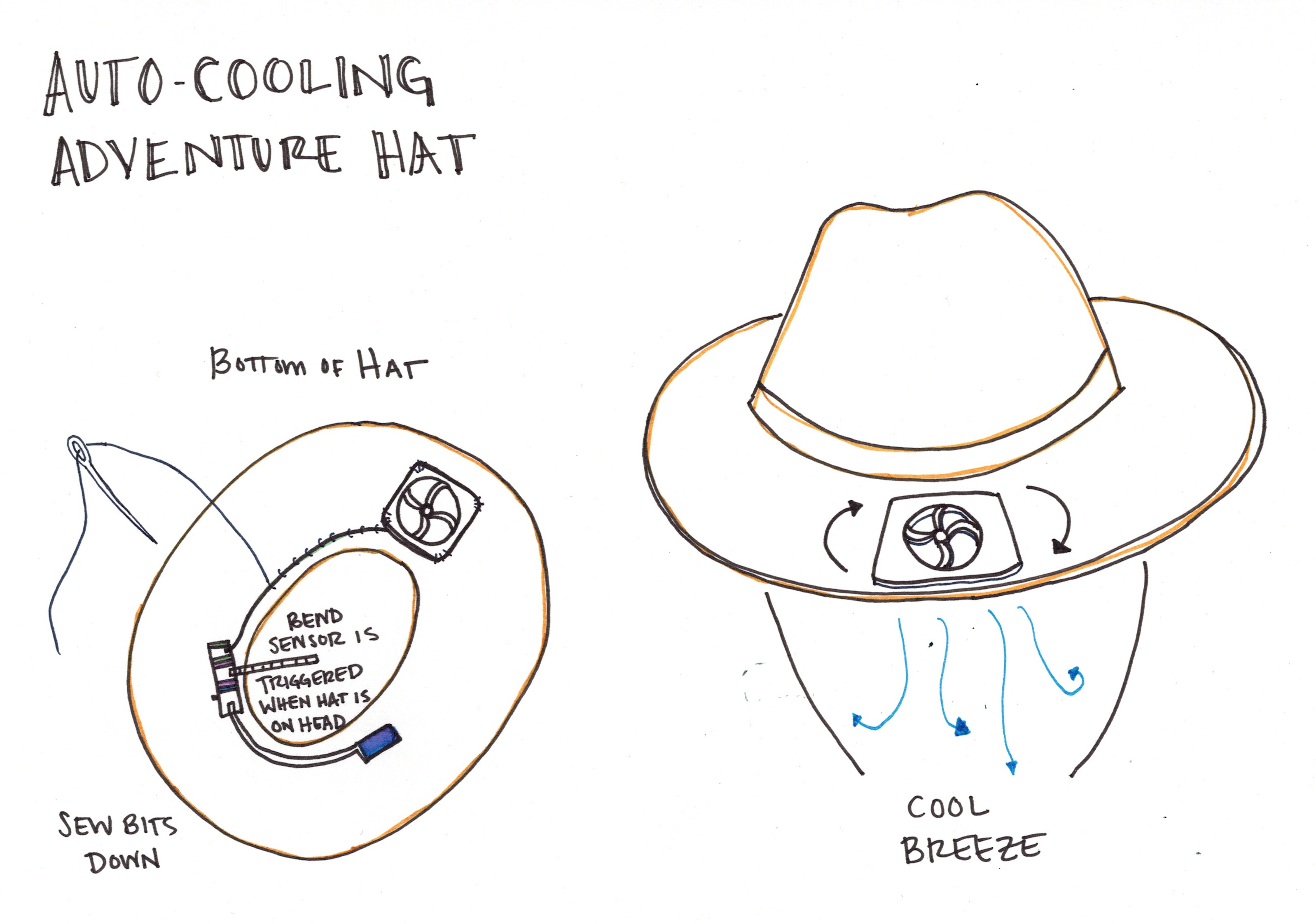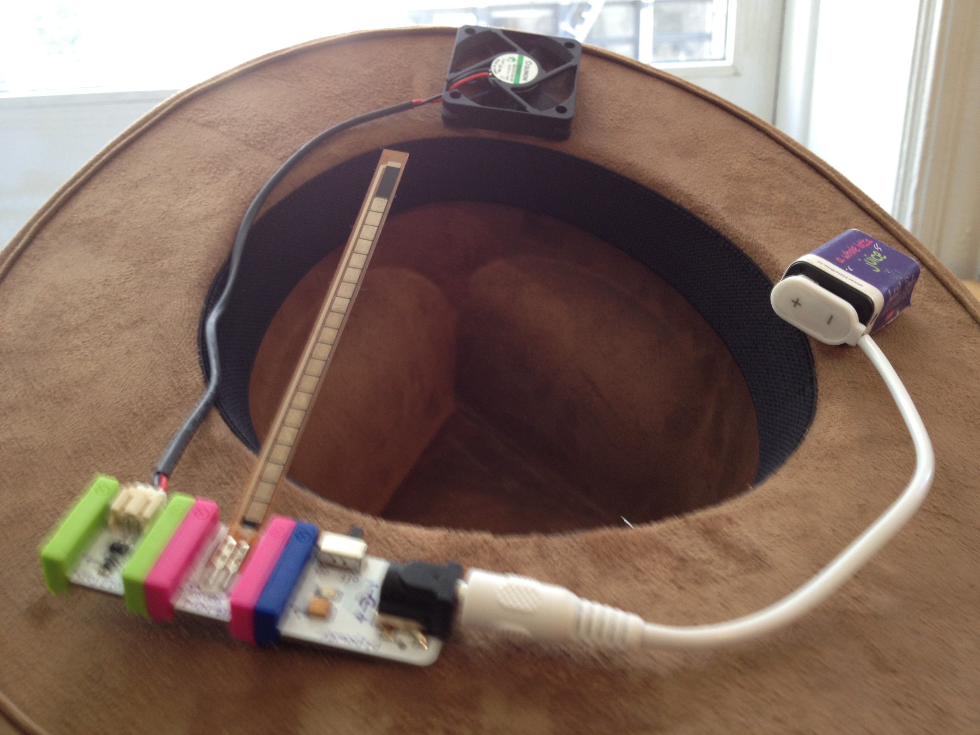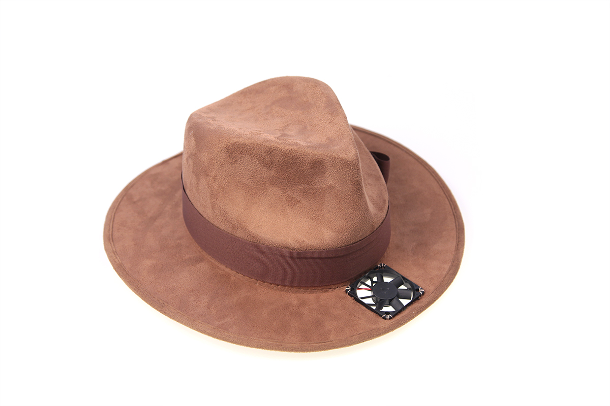 Find a hat that you don't mind cutting up. Lay your circuit out on the underside of the hat. Place the fan at the front of the hat and wrap the rest of the bits around so that they sit at the back of the hat.
