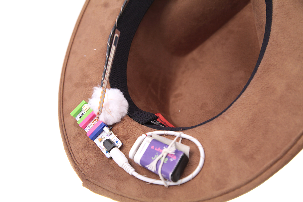 Sew the rest of the circuit down. When you do this, make sure that the bend sensor is hanging over and into the center of the hat. This way, when you put the hat on your head, the bend sensor is triggered. The bend sensor may need a small amount of material underneath it so that it bends at the right angle. We sewed a cotton ball to the hat at the base of the bend sensor to get it to bend just right.