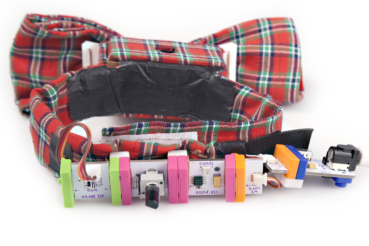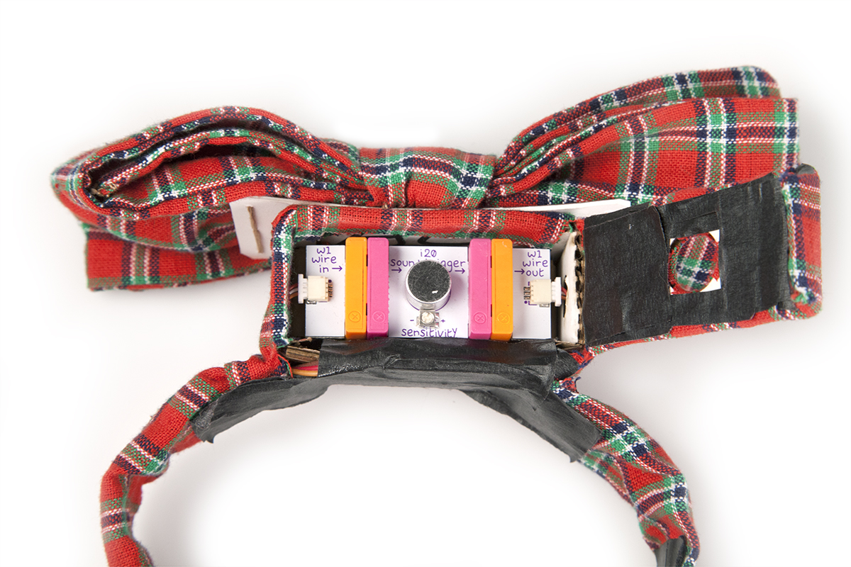 This festive bow tie moves on a servo and is activated by the sound of your voice! Control how it moves with a pulse and a dimmer.